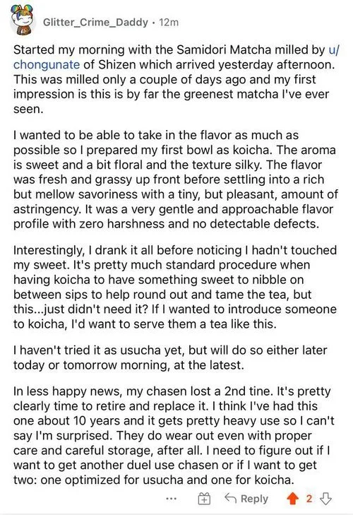 What is Matcha before it’s ground into powder? It’s an unrefined “crude tea” known as Tencha. We sell the Samidori Tencha Shirakawa (さみどり) we stone-mill here in Lawrenceville NJ into this Matcha. It’s an educational (and tasty) way to dive deeper into Matcha and Matcha production.